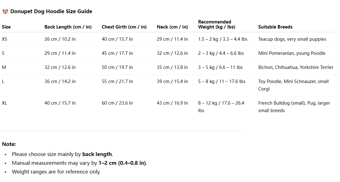 Donupet Dog Hoodie Size Guide Size Back Length (cm / in) Chest Girth (cm / in) Neck (cm / in) Recommended Weight (kg / lbs) Suitable Breeds XS 26cm / 10.2in 40cm / 15.7in 29cm / 11.4in 1.5–2kg / 3.3–4.4lbs Teacup dogs, very small puppies S 29cm / 11.4in 45cm / 17.7in 32cm / 12.6in 2–3kg / 4.4–6.6lbs Mini Pomeranian, young Poodle M 32cm / 12.6in 50cm / 19.7in 35cm / 13.8in 3–5kg / 6.6–11lbs Bichon, Chihuahua, Yorkshire Terrier L 36cm / 14.2in 55cm / 21.7in 39cm / 15.4in 5–8kg / 11–17.6lbs Toy Poodle, Mini Schnauzer, small Corgi XL 40cm / 15.7in 60cm / 23.6in 43cm / 16.9in 8–12kg / 17.6–26.4lbs French Bulldog (small), Pug, larger small breeds Note: • Please choose size mainly by back length. • Manual measurements may vary by 1–2 cm (0.4–0.8 in). • Weight ranges are for reference only.