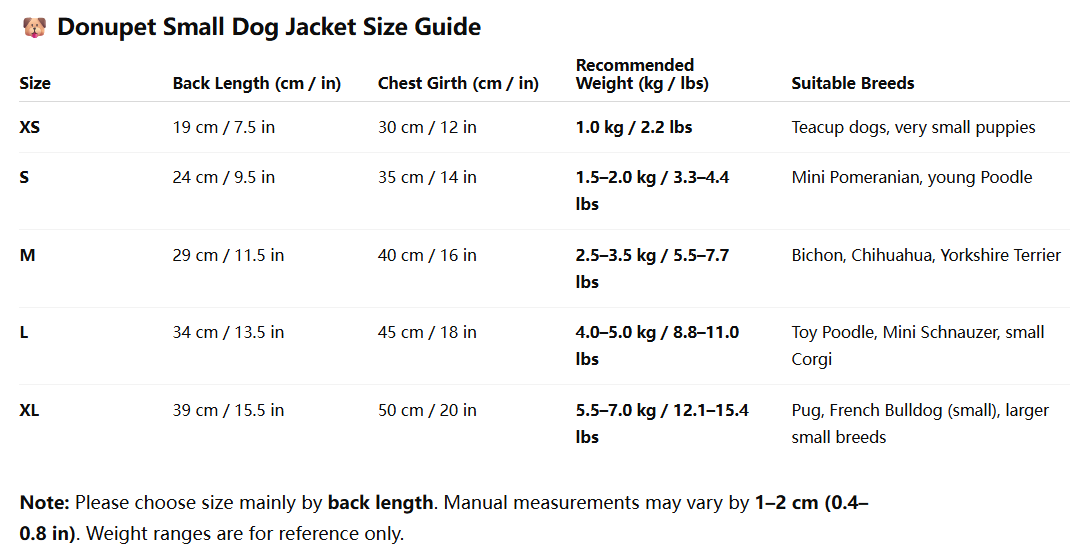 Donupet Small Dog Clothing Size Guide Size Back Length (cm / in) Chest Girth (cm / in) Recommended Weight (kg / lbs) Suitable Breeds XS 19cm / 7.5in 30cm / 12in 1.0kg / 2.2 lbs Teacup dogs, very small puppies S 24cm / 9.5in 35cm / 14in 1.5–2.0kg / 3.3–4.4 lbs Mini Pomeranian, young Poodle M 29cm / 11.5in 40cm / 16in 2.5–3.5kg / 5.5–7.7 lbs Bichon, Chihuahua, Yorkshire Terrier L 34cm / 13.5in 45cm / 18in 4.0–5.0kg / 8.8–11.0 lbs Toy Poodle, Mini Schnauzer, small Corgi XL 39cm / 15.5in 50cm / 20in 5.5–7.0kg / 12.1–15.4lbs French Bulldog (small), Pug, larger small breeds Note: • Please choose size mainly by back length.Manual measurements may vary by 1-2 cm (0.4-0.8 in). Weight ranges are for reference only.